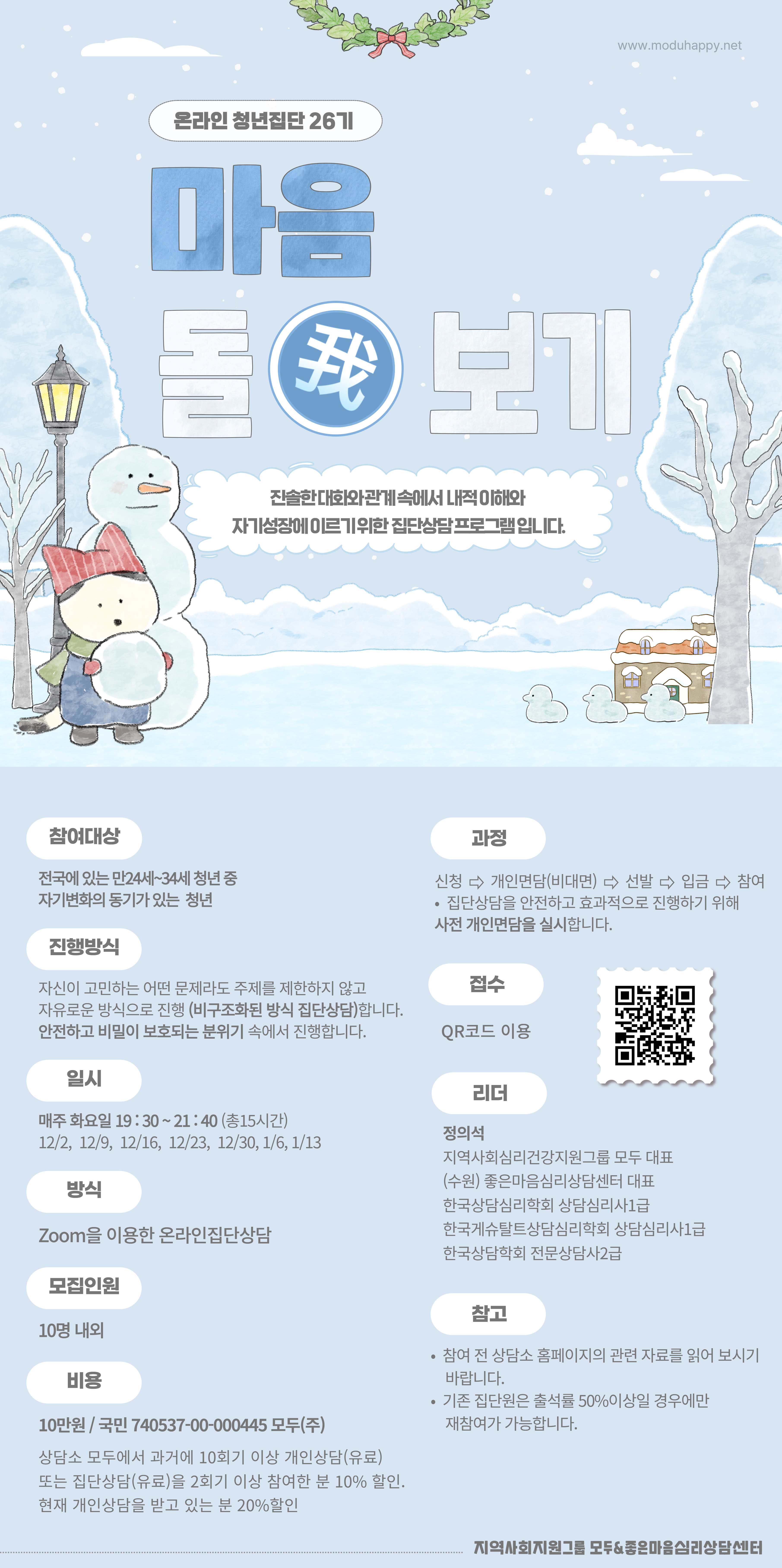 다가오는 12월 쳥년집단상담 '마음돌아보기' 26기가 시작됩니다.